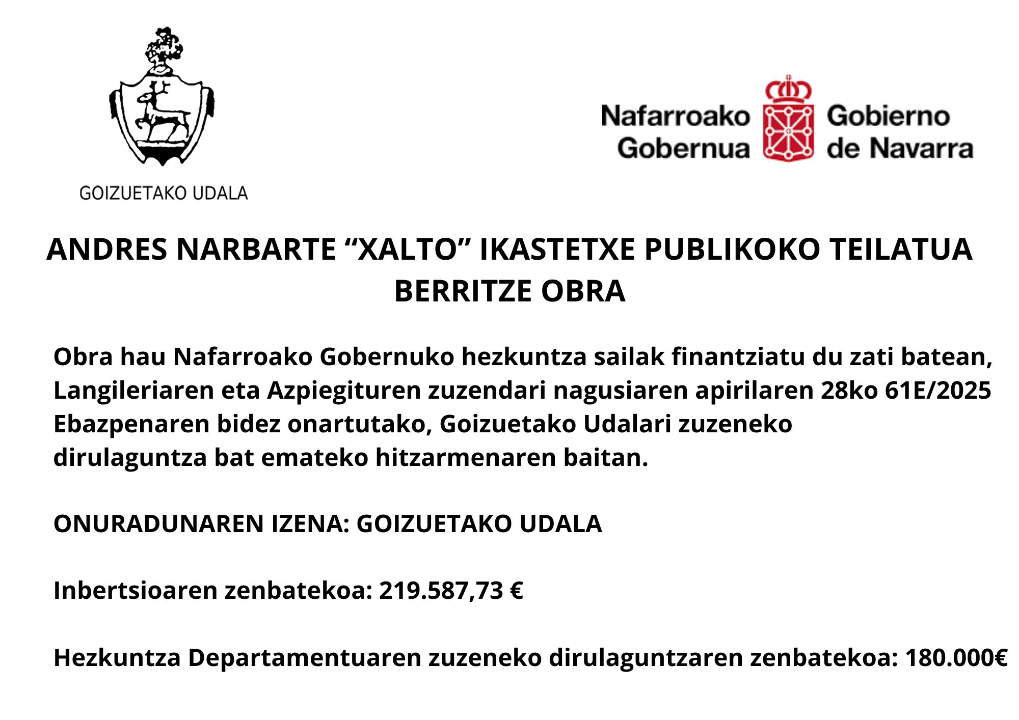 Goizuetako Udala, Herriko Plaza, 4 | Harrera ordutegia: 9:00-12:30 | Tel. 948 51 40 06 | udala@goizueta.eus