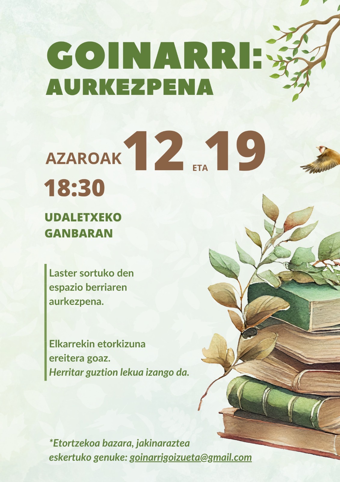 2024an, hainbat herritarrek gure herrian ikasteko, irakurtzeko, lan egiteko eta elkartzeko espazio baten falta sentitu genuen. Behar hori ez zen gutxi batzuena bakarrik, firma bilketa baten bidez, argi geratu baitzen goizuetar askoren nahia zela. Ideia honek udaletxera eraman gintuen eta Cedernaren laguntzaz PDR dirulaguntza eskuratu dugu (50.000 euro ingurukoa) lehen urrats sendoak emateko.